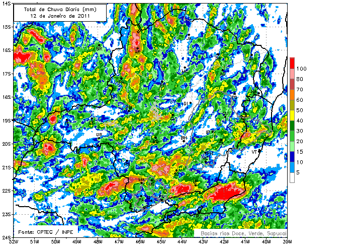 Um mapa das chuvas nos dias 11 e 12 de janeiro de 2011
