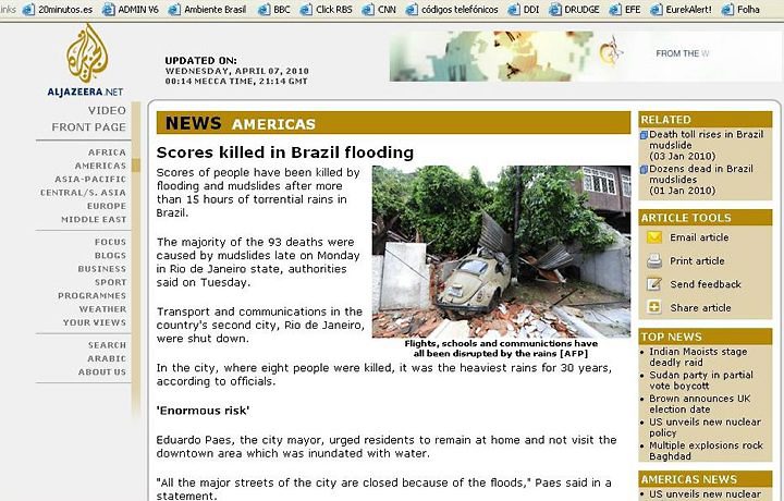As fortes chuvas que afetam a região sudeste do Brasil, mas especilamente, a região serrana do Rio de Janeiro e o campo das vertentes no sul de Minas Gerais está estampada no noticiário internacional. No caso específico do Estado do Rio de Janeiro, que no ano passado sofreu com os problemas associados as chuvas e a urbanização ilegal das enconstas, no município de Angra dos Reis. Esse ano na região serrana, o fato das chuvas atingirem três municípios (Petrópolis, Teresópolis e Nova Friburgo) de uma vez, o que na opinião do vic-egovernador do Estado do rio Pezão é pior do que o caso de Angra. Agora, uma pergunta. Por onde anda nosso governador do Estado Sérgio Cabral? Viajando mais uma vez de férias no verão carioca? Até parece que ele não sabe que os problemas relacionados a enchentes, inundações e deslizamentos de terra não existem. E o pior de tudo, é a imprensa marrom, que noticia que o governador está preocupadoo e ligou para a Presidenta Dilma. Ora!!! bolas.... Parece que o caife eleitoral e a imagem de super bem feitor não deve ser arranhada. O mesmo pode atuar muito bem na área de segurança pública, mas em contrapartida não está fazendo o que tem que ser feito par habitação, para não citar a educação do estado o Rio que se encontra entre as piores do Brasil.